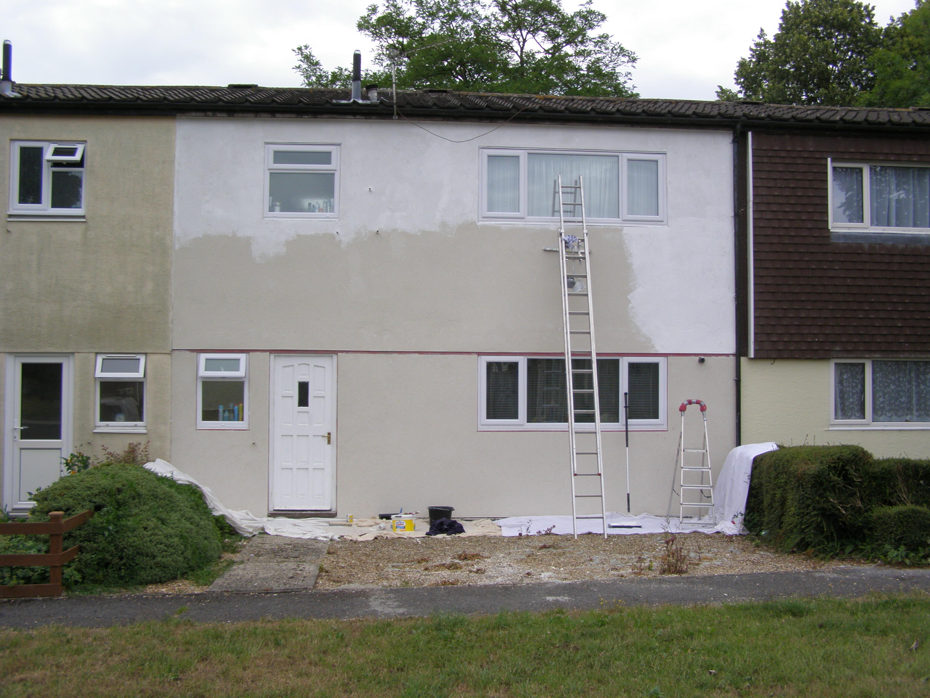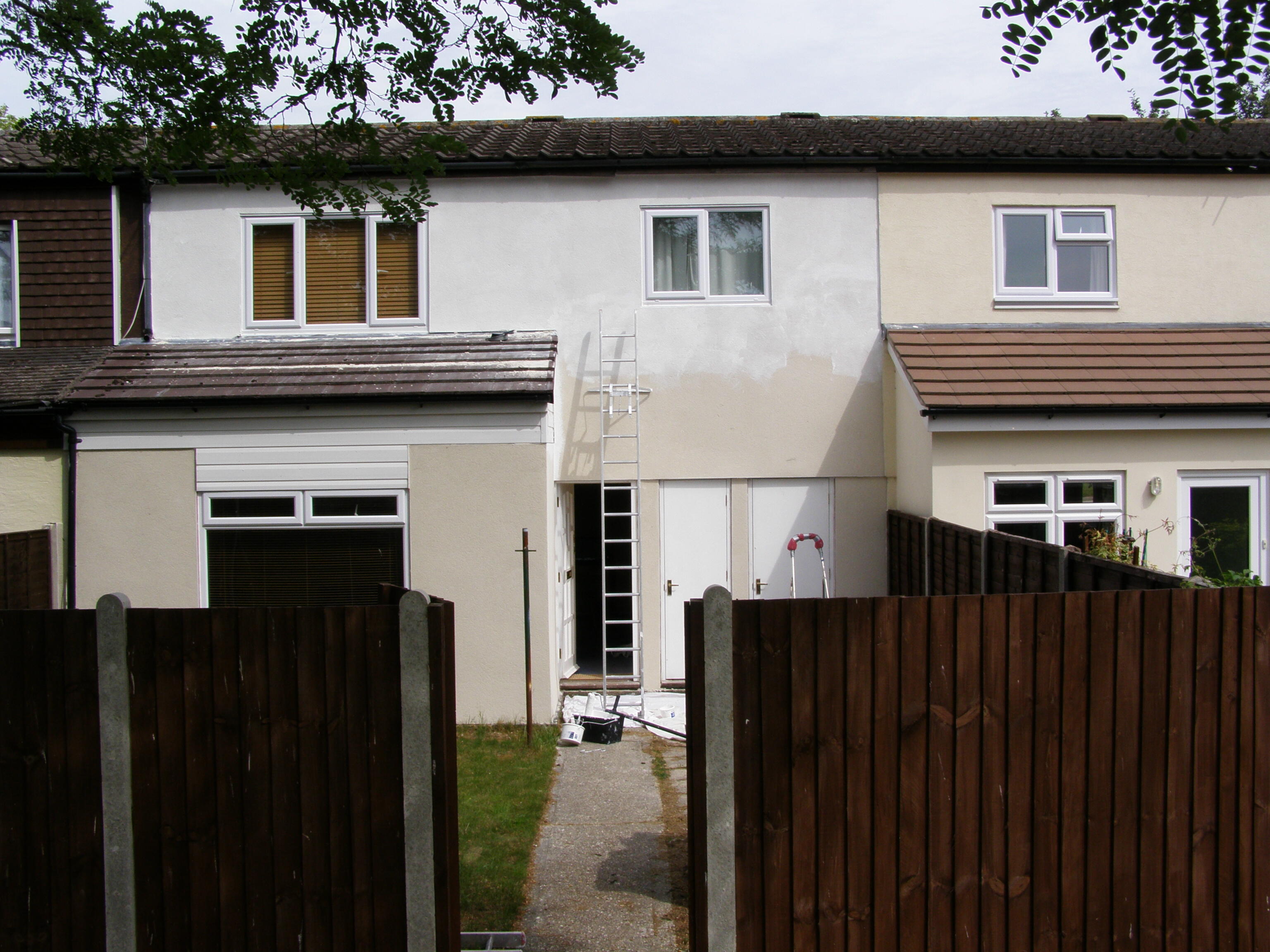 | This property in Basingstoke had recently been externally rendered in a concrete and sharp sand mix. Having been left for several months to ‘go-off’ fully, the client required a whitewash to further protect and extend the lifespan of the render. Under a tight budgetary constraint, the property was first given a mist coat, allowing the paint to penetrate all nooks, crannies and pinholes in the render, followed by two full coats – all in Sandtex masonry paint. Whilst completing the project, it was noted that the fascia board was in need of some attention. The fascia board was rubbed down and given two coatings of Sadolin external wood protection.