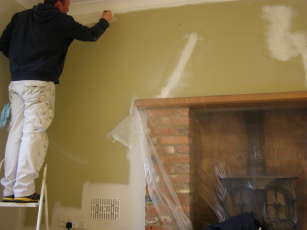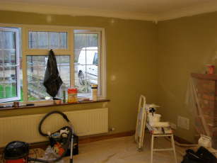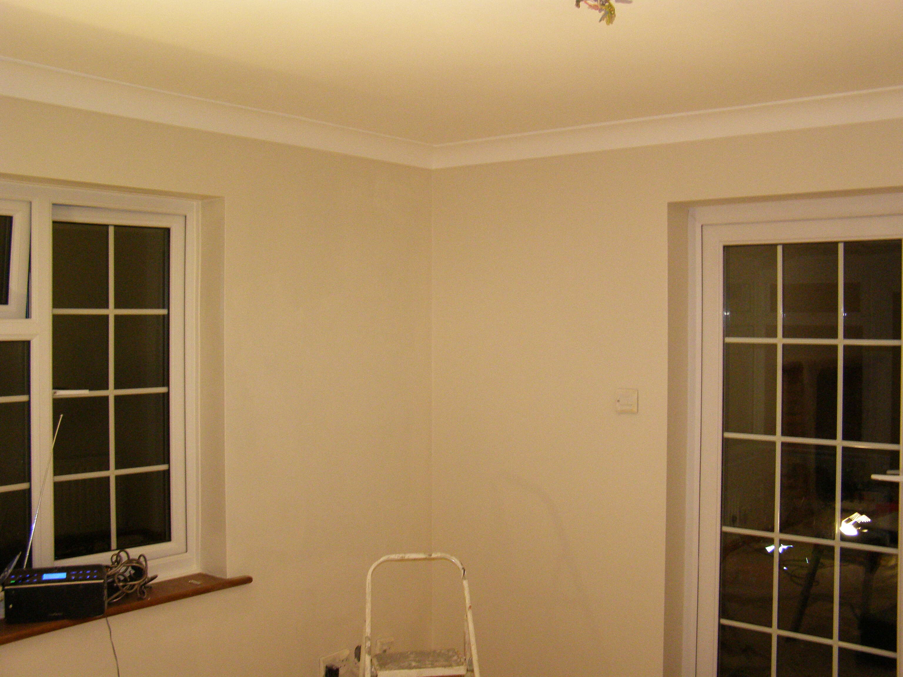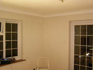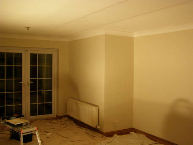 | A fairly straightforward lounge project here. The ceiling required extensive sanding to remove paint skids, lumps and bumps and coving needed some remedial work before repainting ceiling in a flat matt and applying Dulux Diamond Matt paint to walls. | |||||